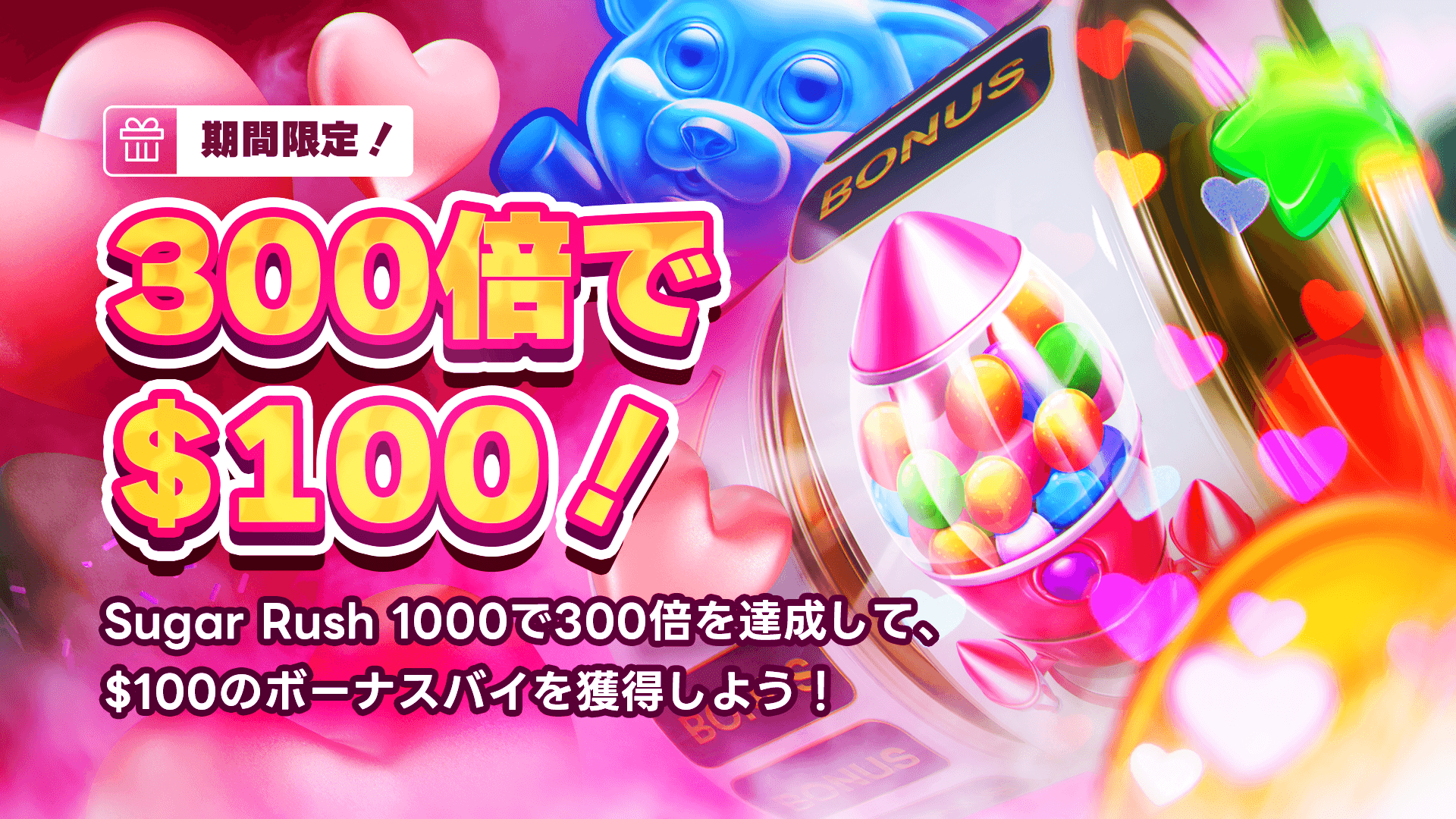 Sugar Rushで300倍を達成すると、あなたのアカウントに$100のボーナスバイをプレゼントします!
